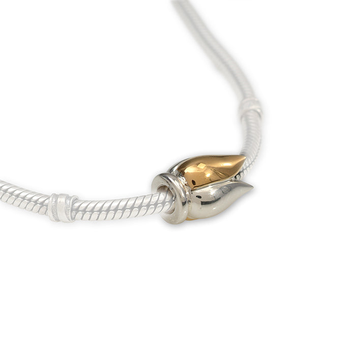 This sterling silver bead ferrule with 24ct gold detailing is very heavy and with the weight comes the sense of luxury. The 24ct gold detailing adds interest and can be used right sided or left or in combination to add an attractive focal point to the bracelet. It can be used on any of our trove bracelets and necklaces. Like all our beads it is supplied with its own faux leather pouch and an attractive branded pillow box to make it the perfect gift.